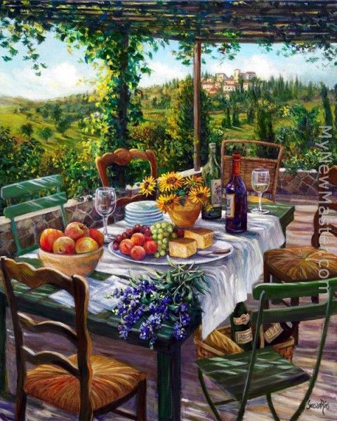 We offer 100% handmade reproduction of Sung Kim garden terrace painting for sale.